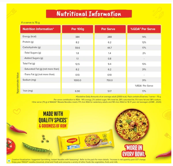 MAGGI 2-Minute Instant Noodles, Masala Noodles With Goodness Of Iron, M, pack of 8 (560g Pouch)